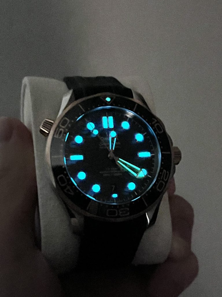 ですが、なんといってもこのモデル最大の特徴はやはりセドナゴールドでしょう。ベゼルの一部とスケルトン針、インデックス、リューズとヘリウムエスケープバルブにオメガ独自の18Kセドナゴールドが使われています。そこまで派手なゴールドではないので、上手くデザインに馴染んでいると思います。