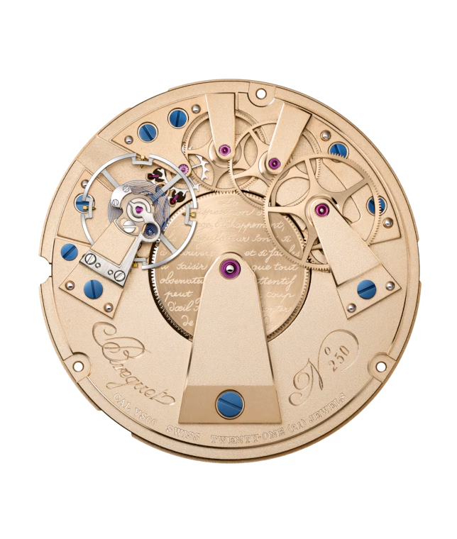 搭載するムーブメントは96時間のロングパワーリザーブを誇る「Cal.VS00」。今年ブレゲが発表した「ケ・ド・ロルロージュ」という新しいタイプのギヨシェ模様が施された非常に美しいムーブメントです。